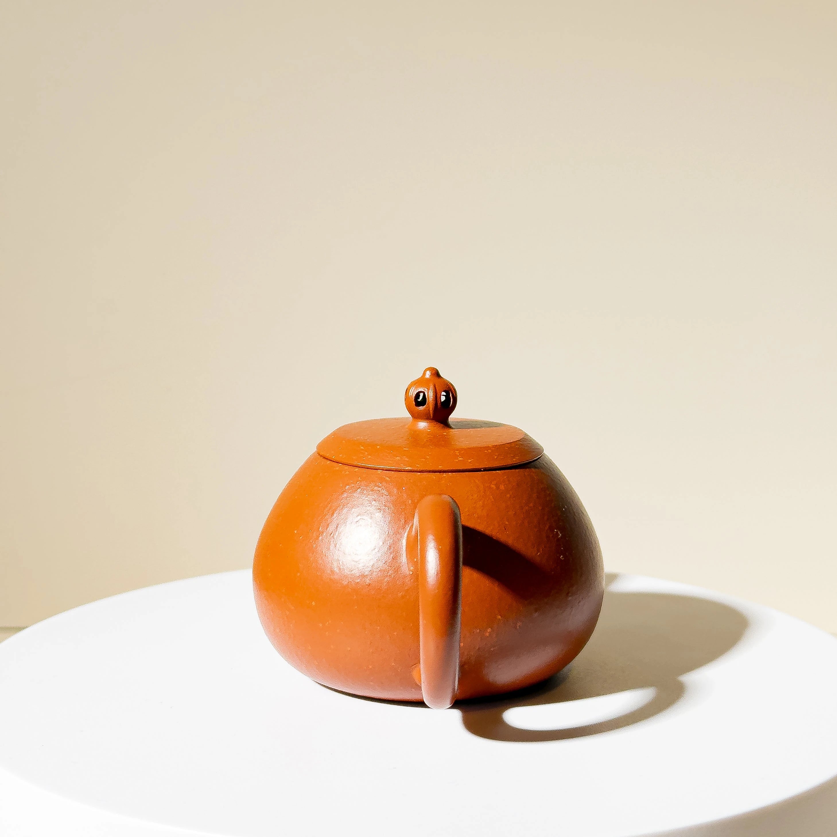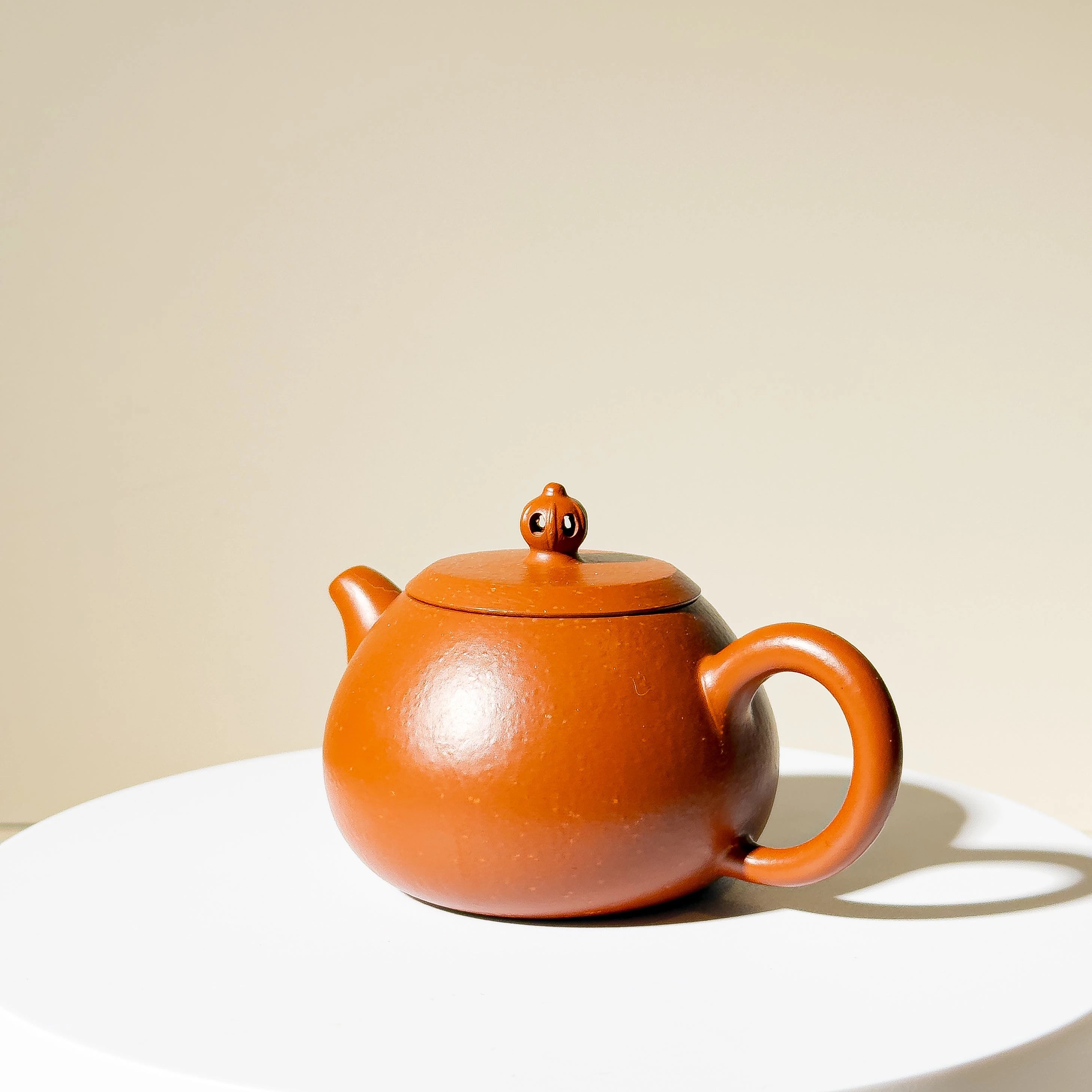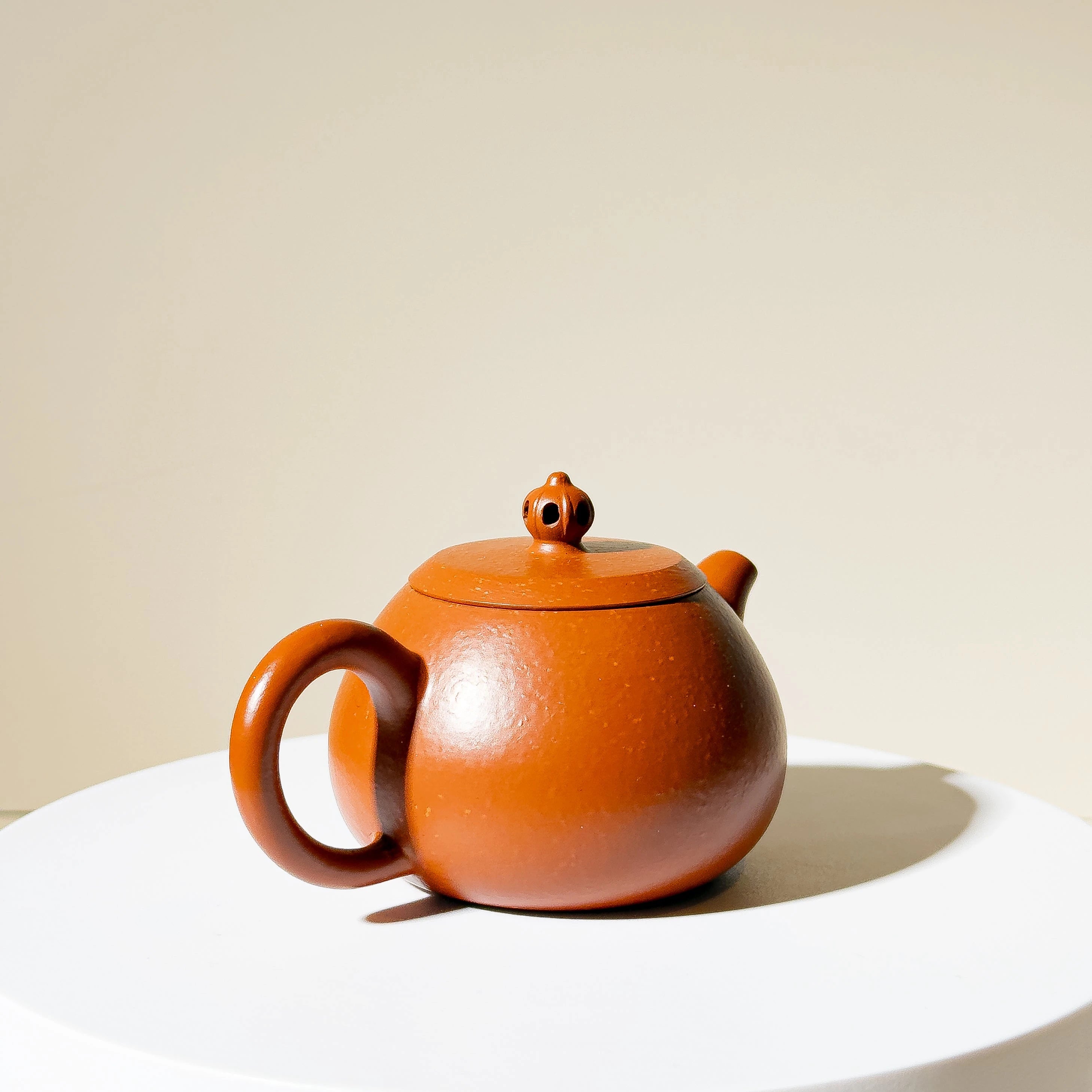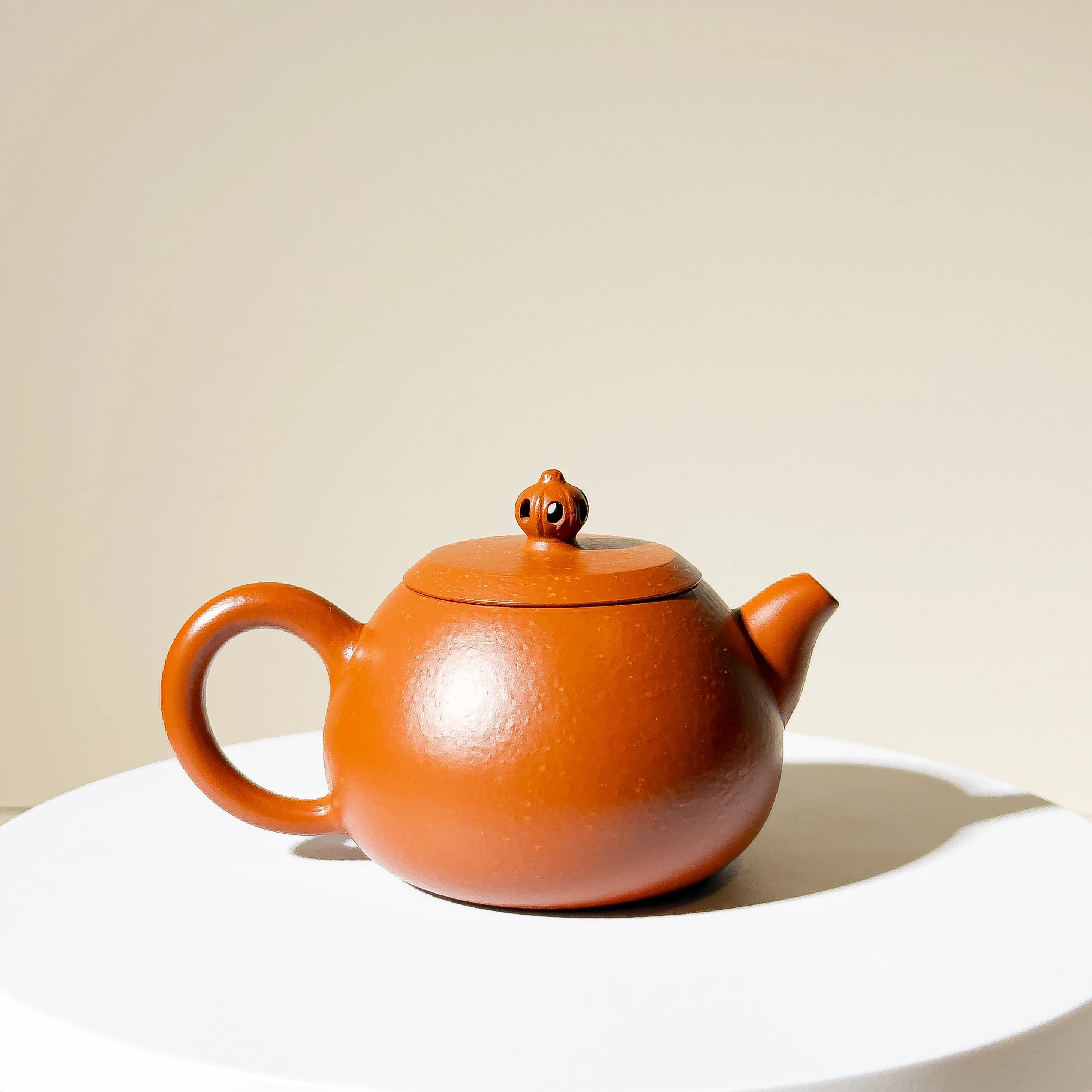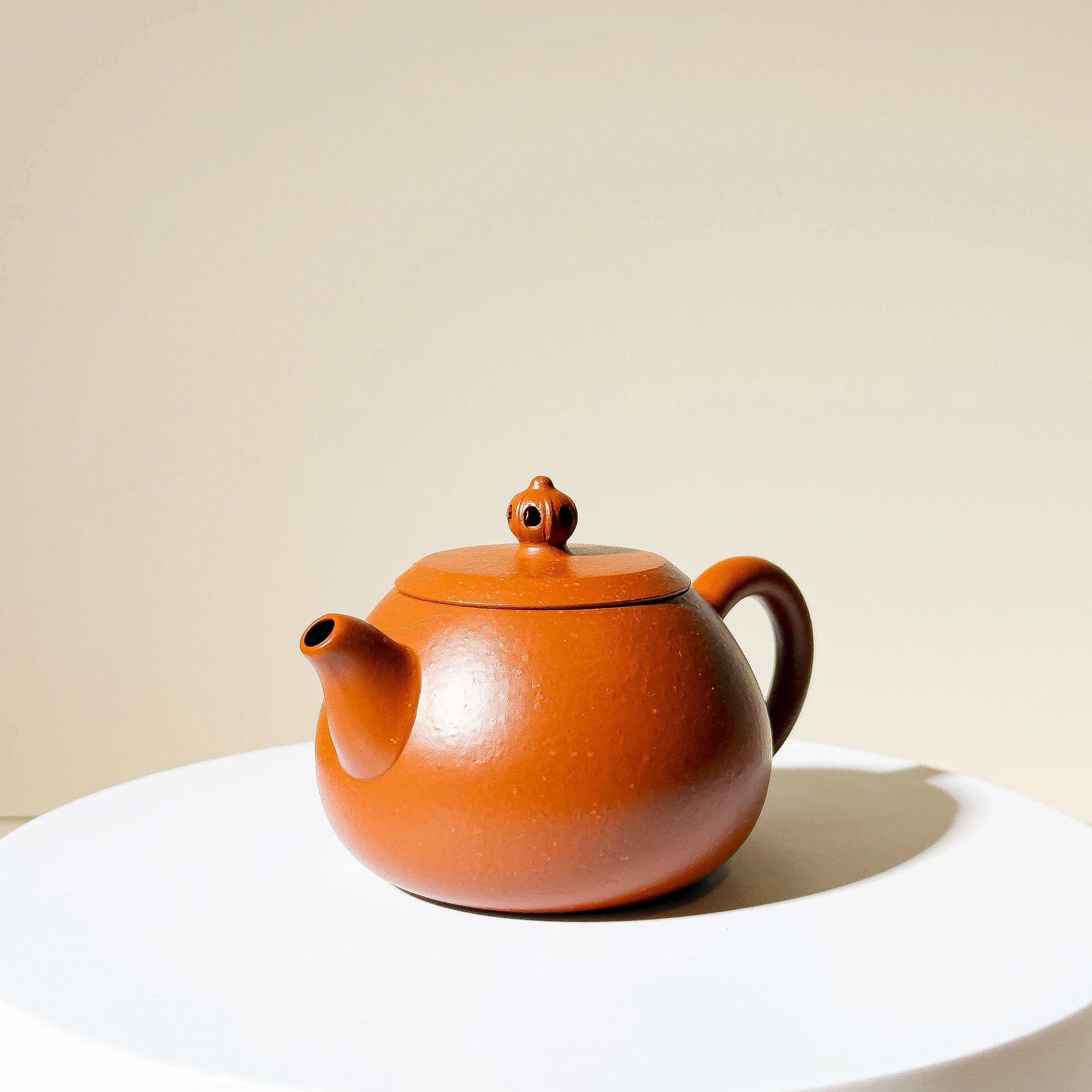 Crafted from Zhu Ni (朱泥) mixed with some clay with larger particles, the material offers a warm tone with natural touch. While not premium Zhu Ni or aged clay, the teapot's charm lies in its elegant proportions and clever design. The lid is topped with a hollowed scepter-style finial — a rare and playful detail that gives the simple body a touch of visual delight.