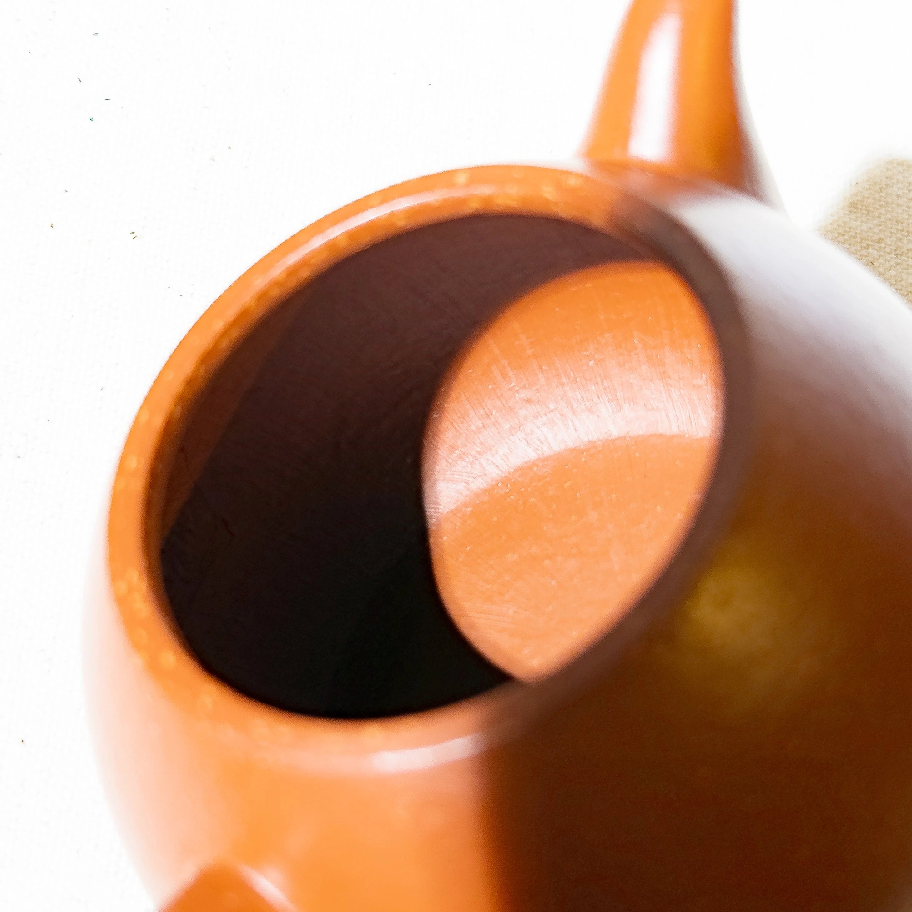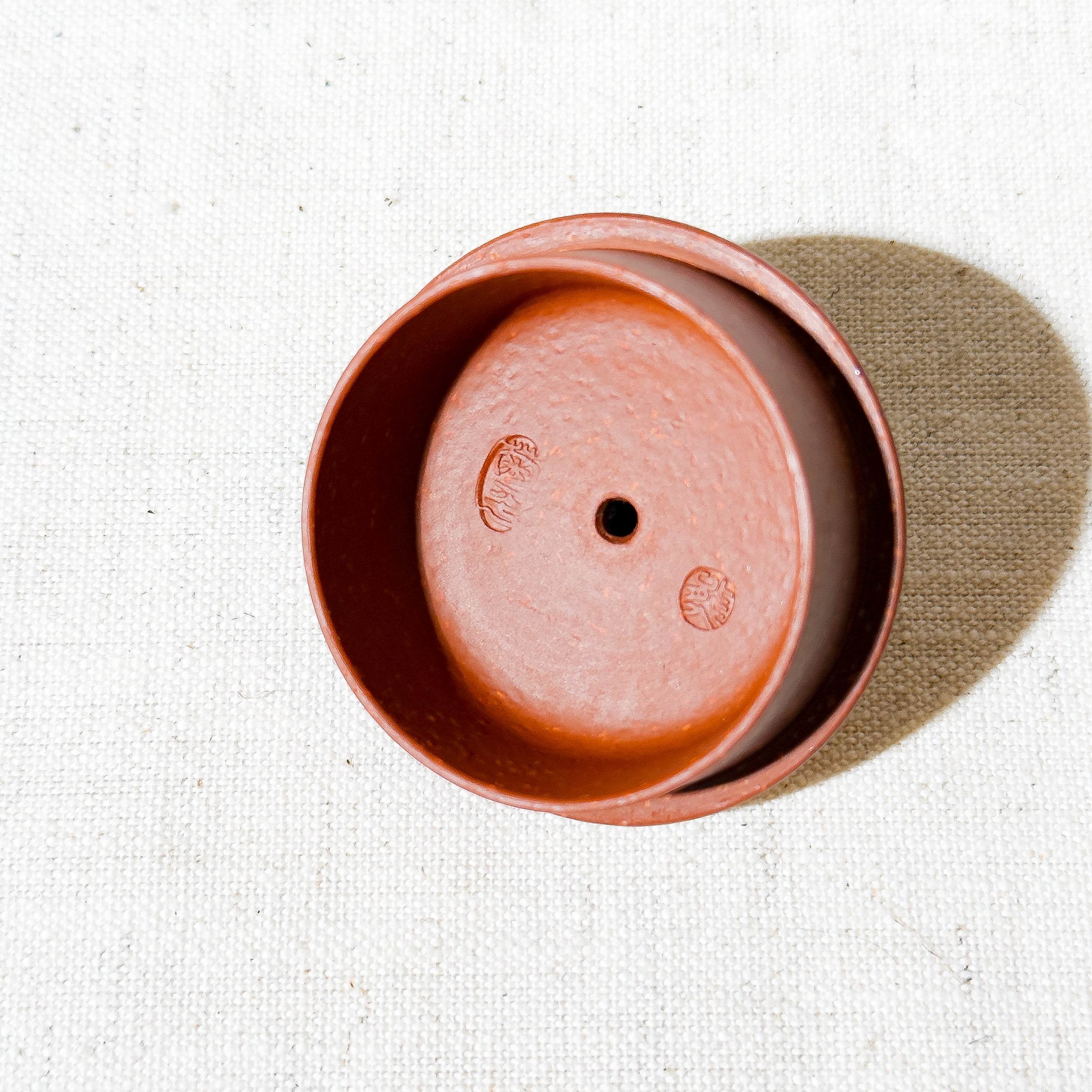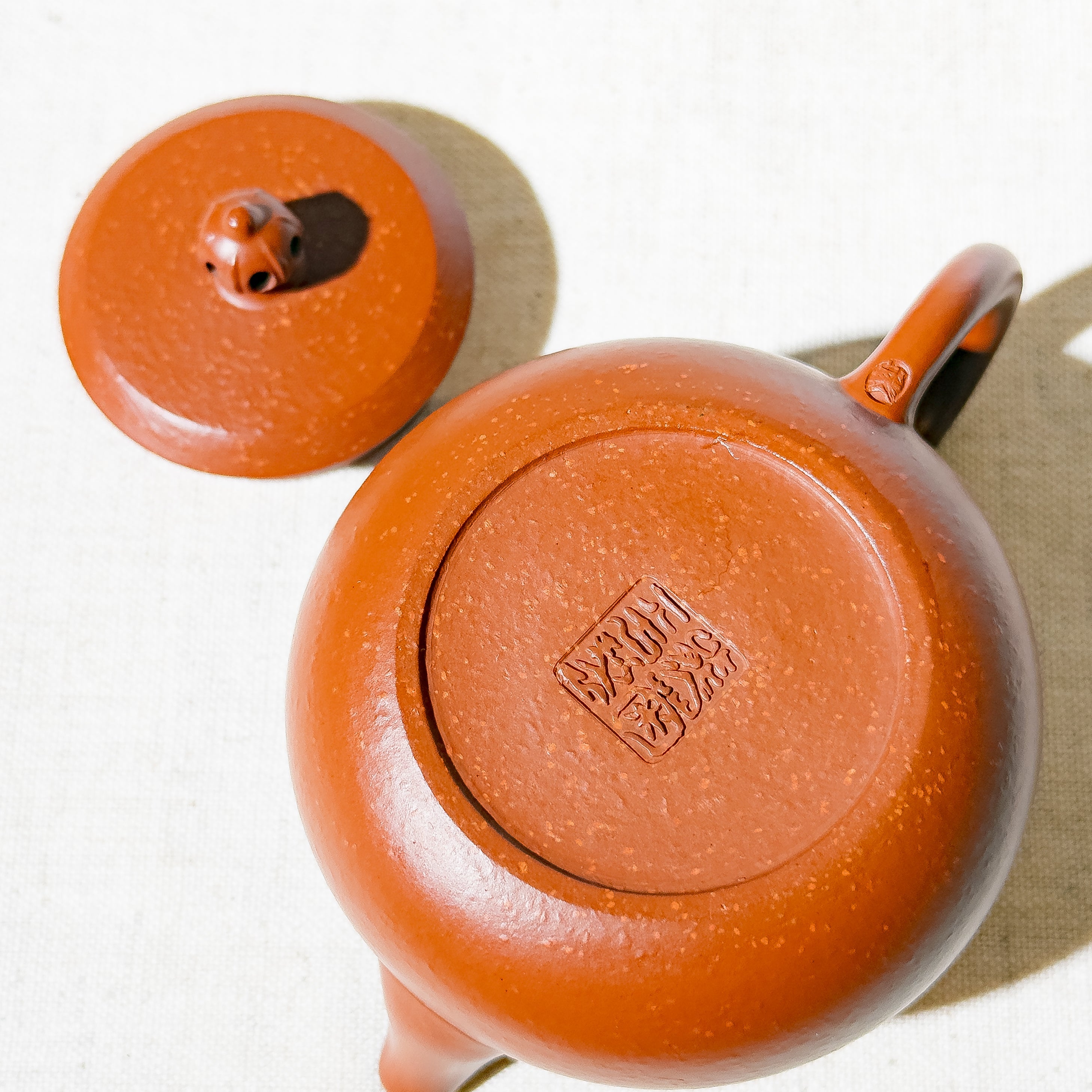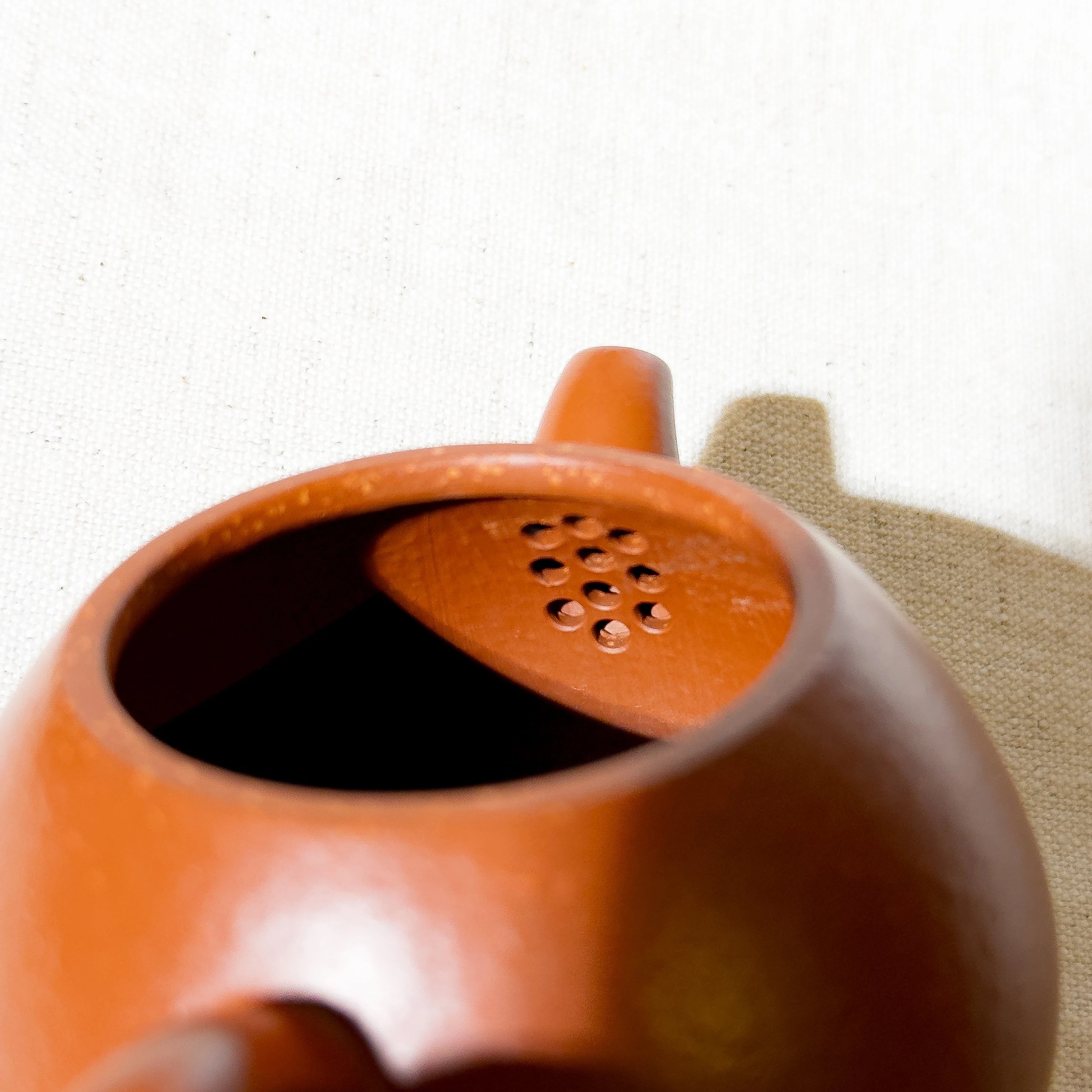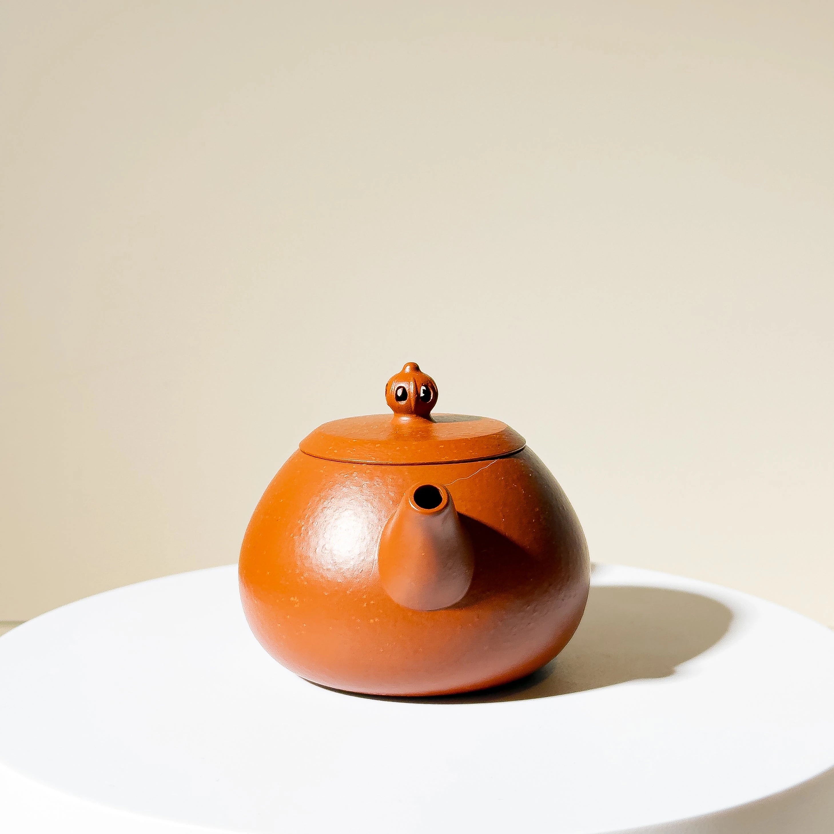Crafted from Zhu Ni (朱泥) mixed with some clay with larger particles, the material offers a warm tone with natural touch. While not premium Zhu Ni or aged clay, the teapot's charm lies in its elegant proportions and clever design. The lid is topped with a hollowed scepter-style finial — a rare and playful detail that gives the simple body a touch of visual delight.