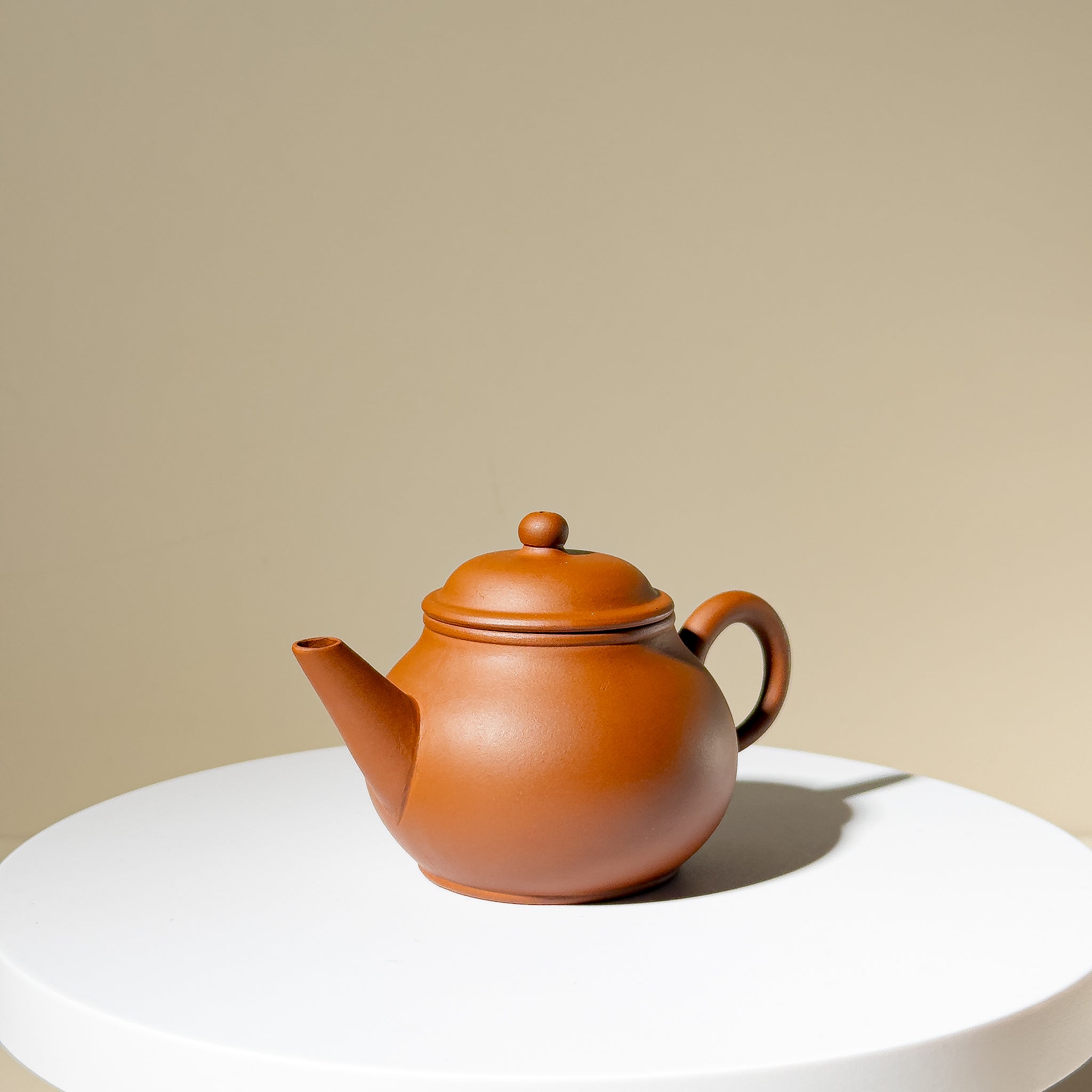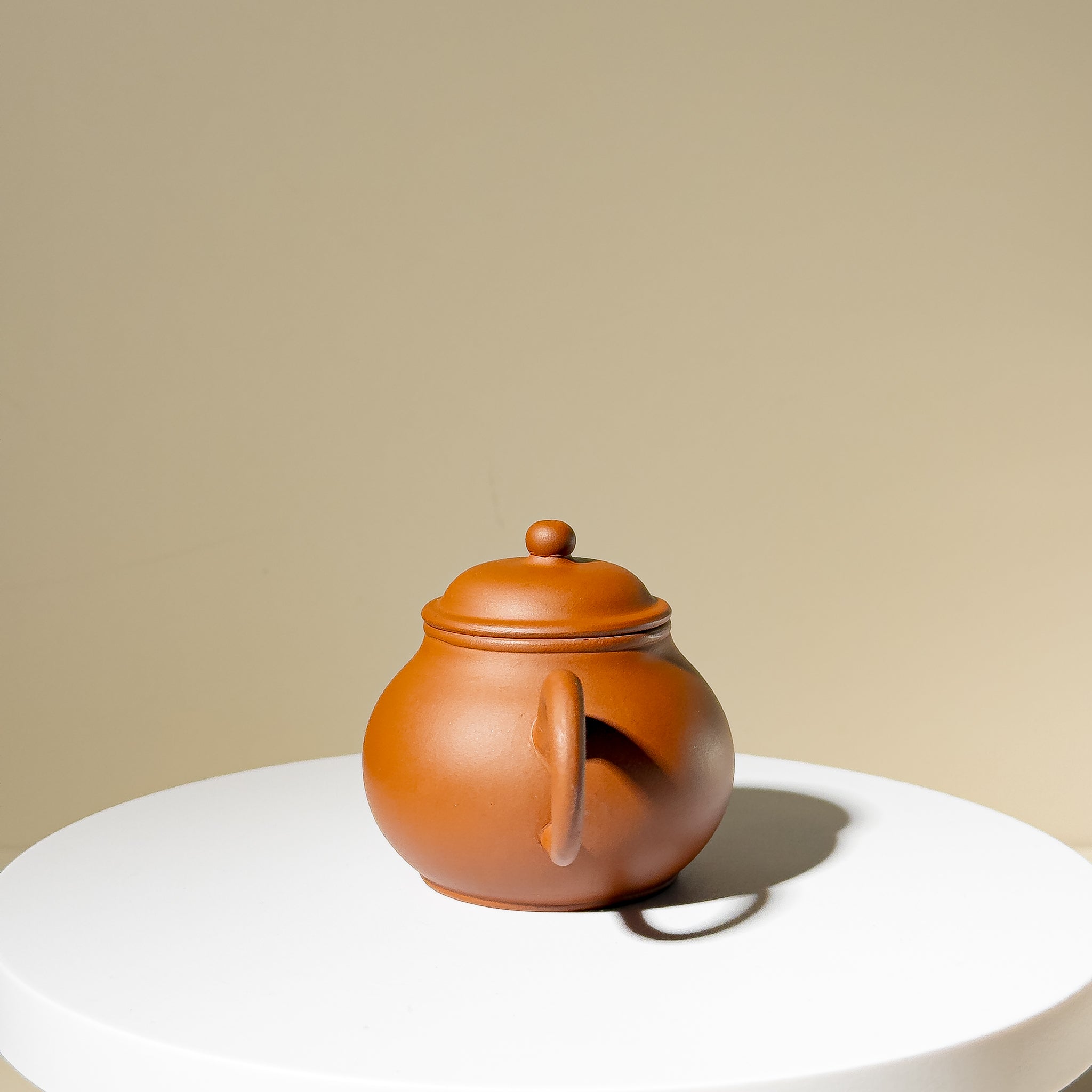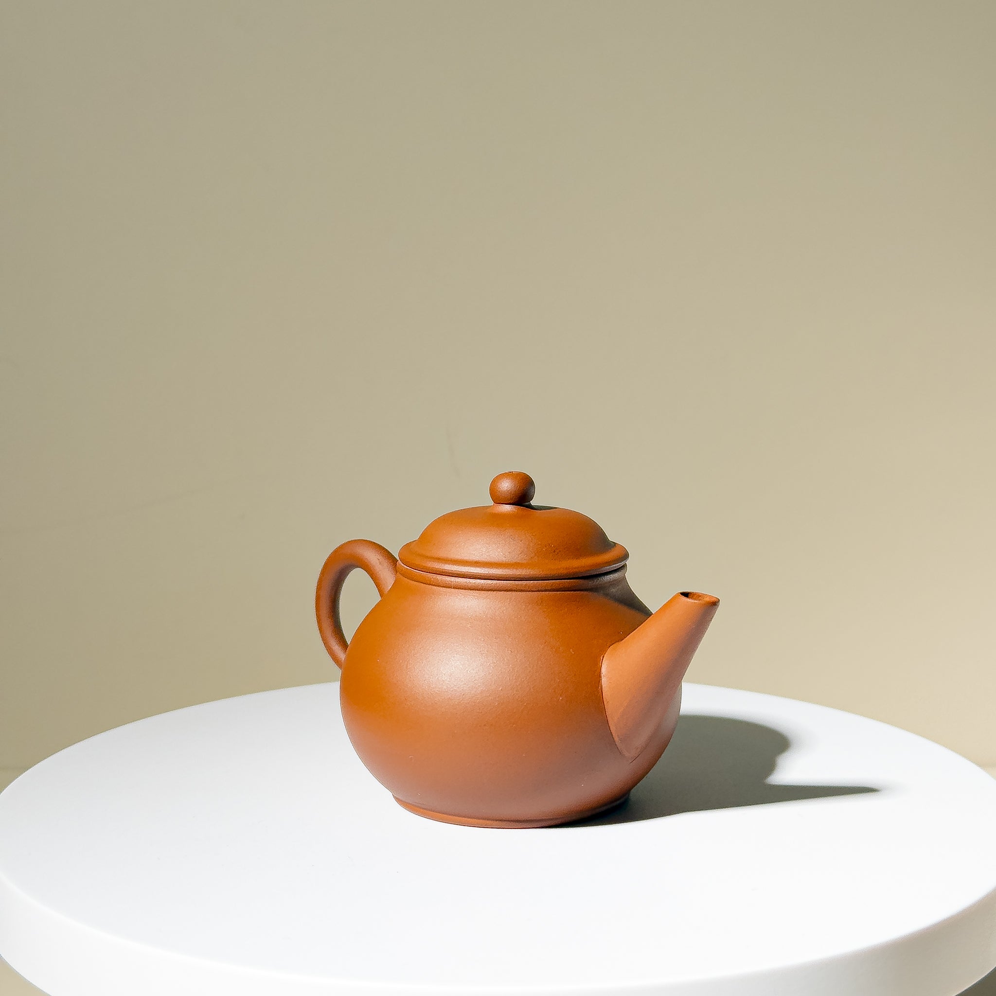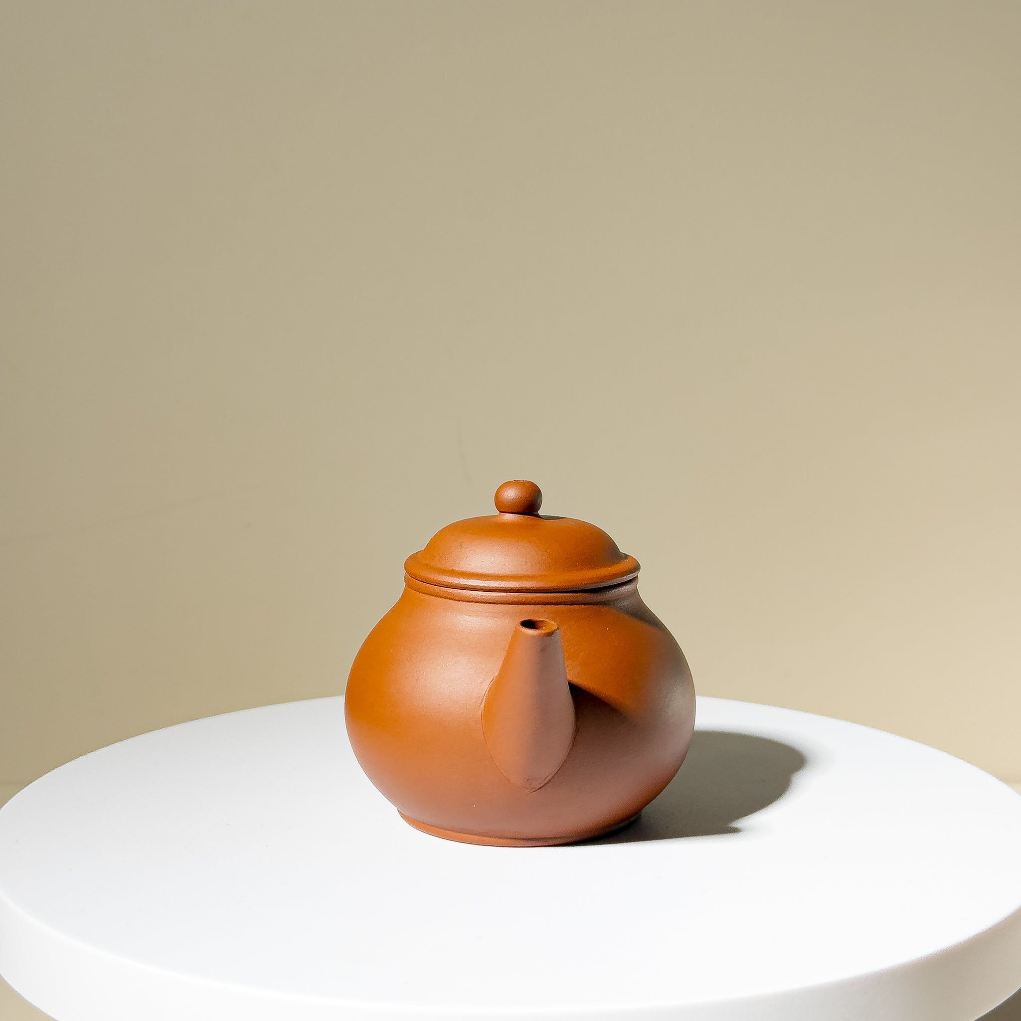 Crafted from fine Niangao Clay (年糕土), this 90ml Yixing teapot embodies the warmth and softness typical of 1970s studio wares. The form, commonly known among collectors as "Guava(芭樂)" or "Line-Piao" (線瓢壺), features a rounded, melon-like body and a finely balanced spout-handle-lid alignment, all executed with meticulous attention.